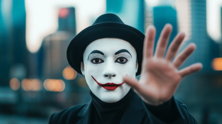 Mime with striking white makeup and a classic black hat, displaying a stop sign with hand in an urban setting, featuring blurred skyscrapers in the background