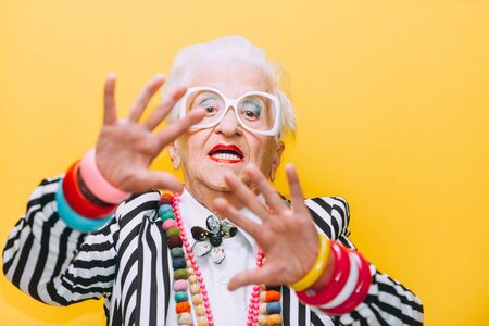 Funny grandmother portraits. Senior old woman dressing elegant for a special event. granny fashion model on colored backgrounds