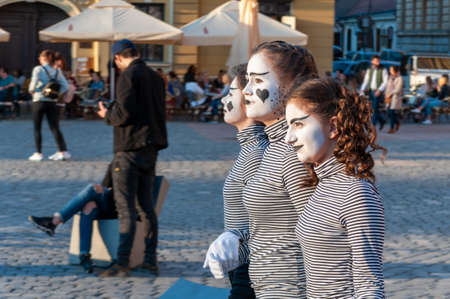 Timisoara, Romania - March 31, 2017: Girls in mime costume walking on the street at the CheckArt Carnaval