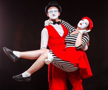 Portrait of two mime artists, isolated on black background. Man holds woman in his arms. Symbol of happy marriage, sweet couple, love, family