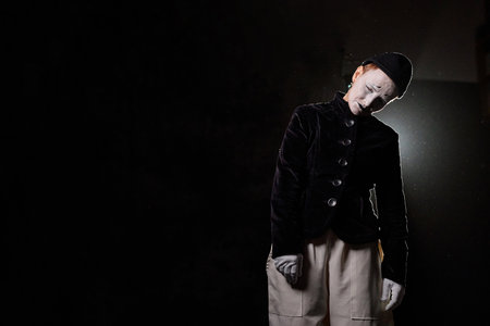 Minimal portrait of sad mime standing on stage in contour lighting against black background, copy space