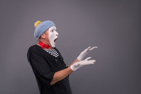 Waist-up portrait of funny and surprised male mime in red head and with white face and opened mouth looking aside and breeding his hands isolated on grey background with copy place