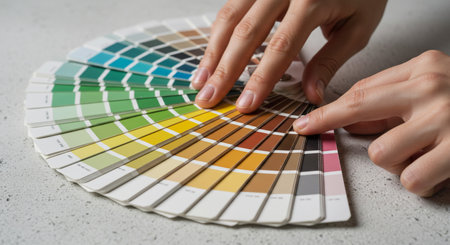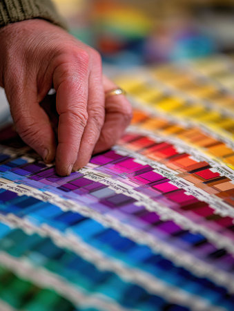 A hand selects color swatches from an array laid out in an artistic studio, showing vibrant hues for a design project in progress.