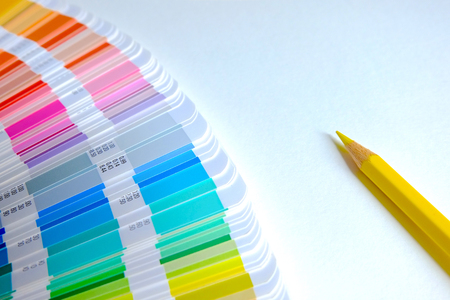 Color samples, colour chart, swatch sample, Graphic designer being selecting Color band and graphics tablet at workplace with work example in camera and laptop on wooden desk.