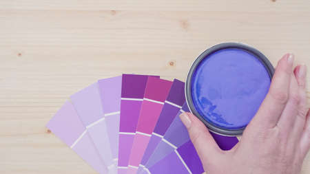 Color swatches with color of the year 2022 in the hand - Very Peri. Color trend palette. Top view, flat lay.