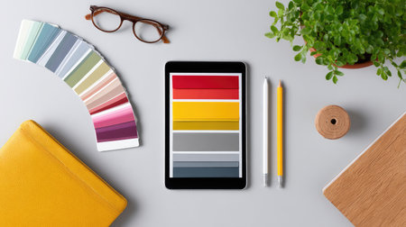 A beautifully arranged workspace showcasing a color palette on a tablet, accompanied by stationery and a potted plant, perfect for design enthusiasts and creative minds.
