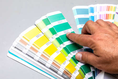 Banner hand of woman decorator, interior and graphic designer, architect is choosing catalogue colors ral for web project