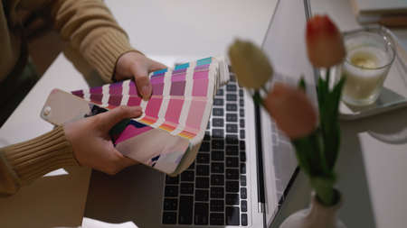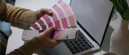 Side view of designer hands choosing colour from colour swatch while working with laptop in home office