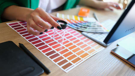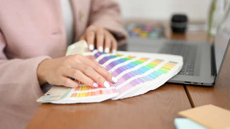 Cropped and close-up hand image, Female graphic designer with a colour swatches samples on the table