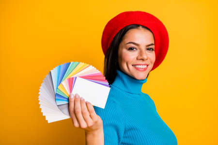 Close-up portrait of nice attractive glad cheerful brunet girl designer holding in hand demonstrating different color type palette cards isolated on bright vivid shine vibrant yellow color background