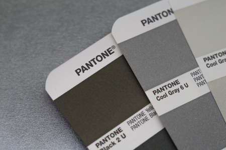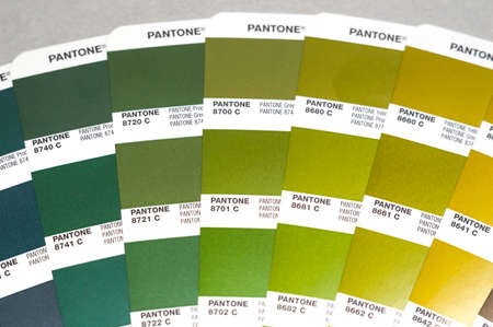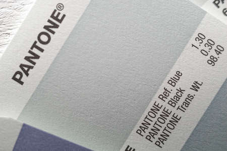 RUSSIA, BERDSK - 2021: PANTONE. Selective focus a sample of the chromaticity of the Pantone color system. Reference colors of paints.