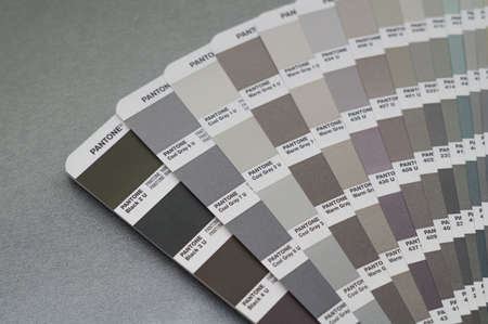 Berdsk, Russia - November 26, 2021: Pantone color palette. A sample of the chromaticity of the Pantone guide. Catalog of color samples. Selective focus