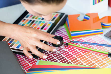 wire-type magnifying glass, on samples of color scale scale for printing and lithography