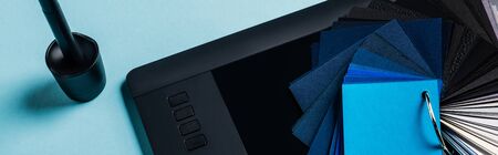 Panoramic crop of stylus, graphics tablet and color swatches on blue background