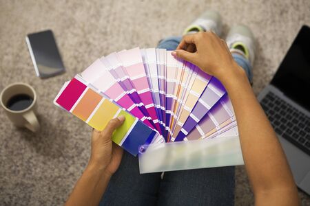 The graphic designer creative team is currently working on the design and color selection on the guide color for advertising design.
