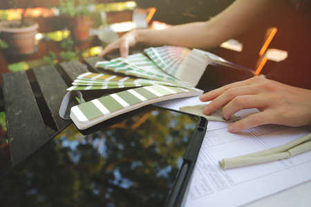 color selection process at a trendy fashion company - close up on woman inspecting a green lab dye fabric sample with tablet computer and color fan in relaxed sunny balcony surrounding