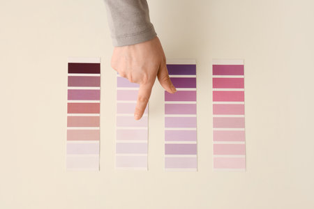Woman hand choosing rosy or pink painting color in sample palettes. Close-up