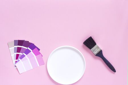 DIY minimalist design concept. Trendy color samples - pink, lilac, purple, magenta and paint brush on pink background. Repair, alteration, creative, art supplies.Top view. Banner. Copy space