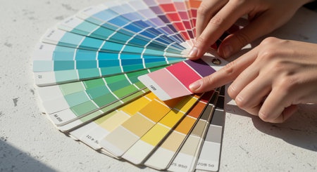 Woman choosing color from color swatches palette. Interior design concept.