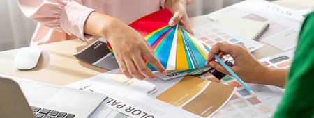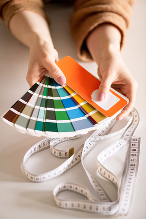 Cropped and close-up hand image, Female graphic designer with a colour swatches samples on the table