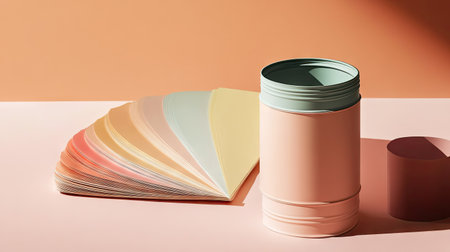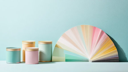 Set of pastel-colored paint cans beside a fan of color swatches, ideal for decor inspiration