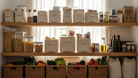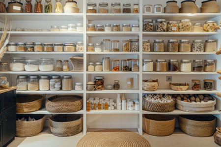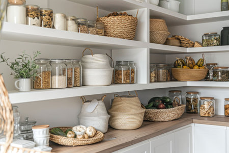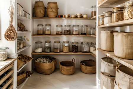 Cozy and organized pantry with shelves filled with jars and natural baskets on a light neutral background