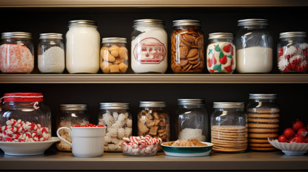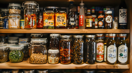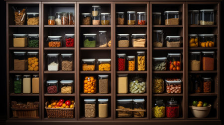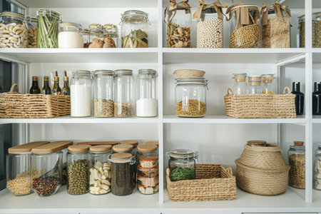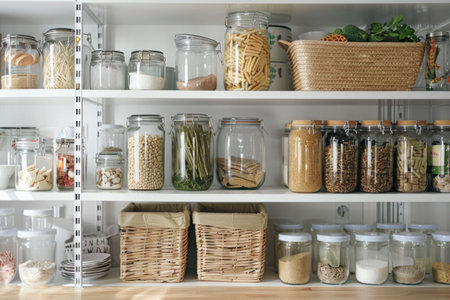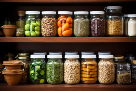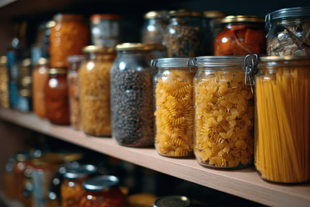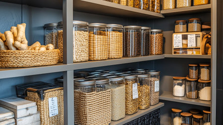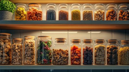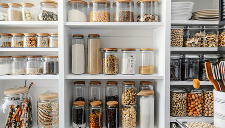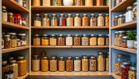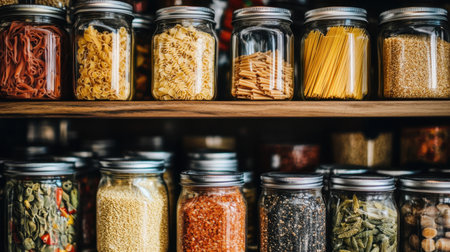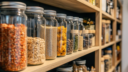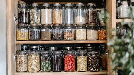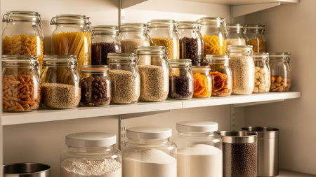 Pantry perfection: Shelves filled with glass jars containing various dry foods, including pasta, grains, and legumes, highlighting a tidy pantry