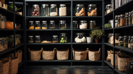 Organization of food storage. Cozy pantry with glass jars and wicker baskets. Dark color palette. Generative AI.