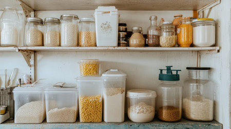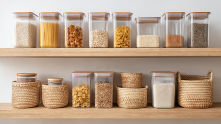 Discover a beautifully organized pantry with transparent containers on shelves, showcasing a neat arrangement of various dry foods and ingredients for kitchen efficiency.