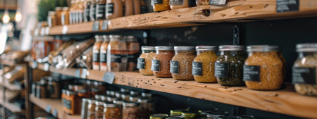 Generative AI : Biodegradable vegan shop for buying eco bio goods glass jar pack on shelf Trendy living life in SME startup store go green market refill bulk shop for reduce climat