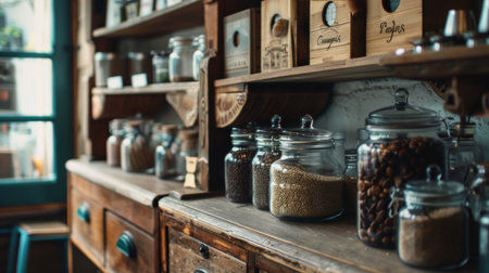 A rustic wooden pantry with jars filled with grains, spices, and nuts, beautifully arranged on shelves, evoking a cozy and traditional vibe.