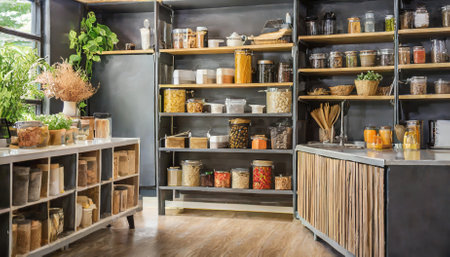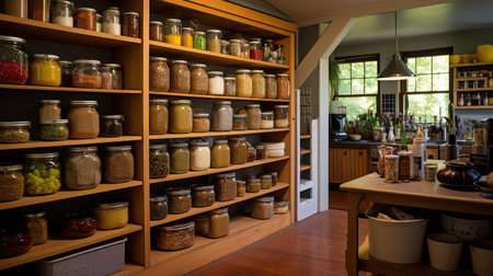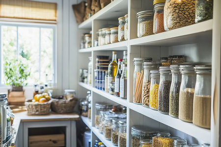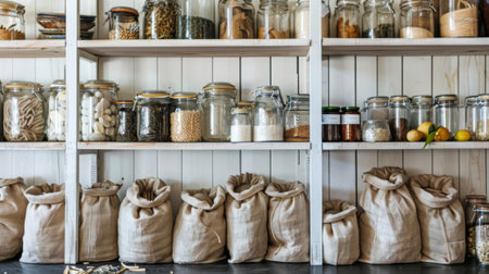 Organized Pantry Room with Glass Jars for Food Storage, Clean and Sustainable Kitchen Design.