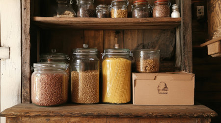 Cozy and rustic pantry showcasing an array of dried ingredients in glass jars, perfect for home cooks seeking healthy and sustainable food storage solutions.