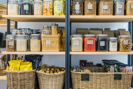 Organized pantry with clear jars and baskets, showcasing a variety of dry foods and ingredients