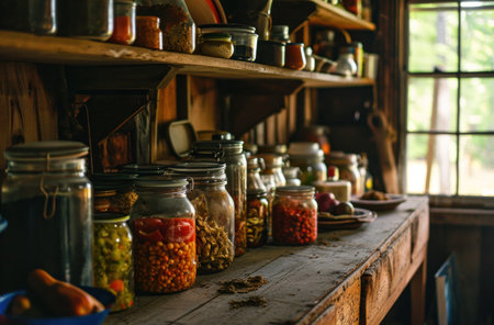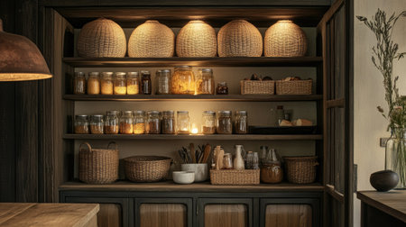A cozy pantry shelf filled with preserved goods, mason jars, and wicker baskets, framed by soft lighting in a country-style home