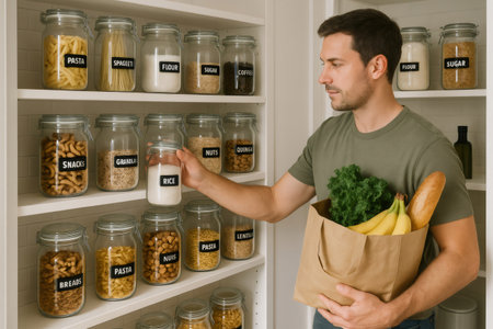 Man placing groceries in labeled glass jars in an organized pantry, promoting food storage and kitchen organization