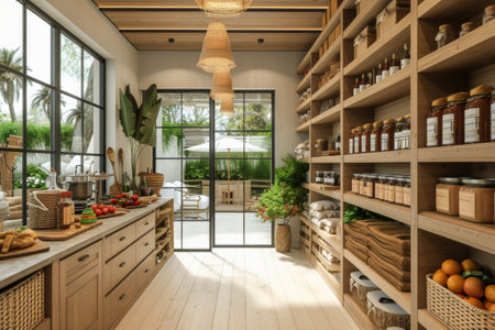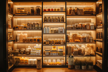 A well-organized kitchen with neatly arranged pantry items, clean countertops, and stylish storage solutions, emphasizing practical and aesthetic design.