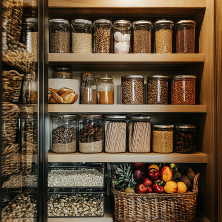 This well-organized pantry showcases a variety of glass jars filled with grains, spices, and legumes, alongside fresh fruits and baked goods, enhancing kitchen aesthetics.