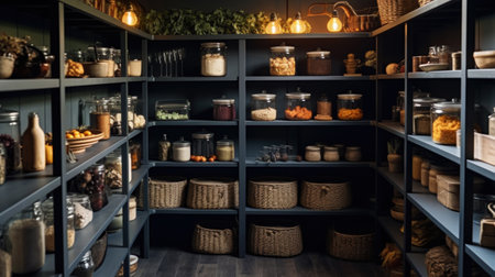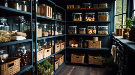 Organization of food storage. Cozy pantry with glass jars and wicker baskets. Dark color palette. Generative AI.