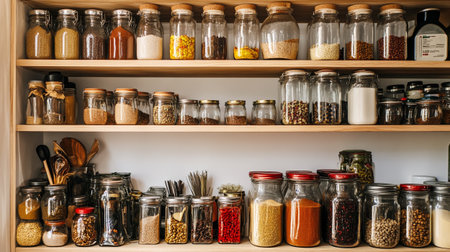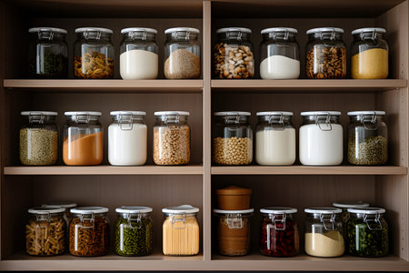 Pantry perfection: Shelves filled with glass jars containing various dry foods, including pasta, grains, and legumes, highlighting a tidy pantry