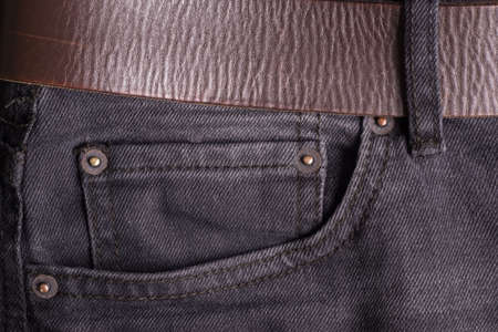 Large front pocket of black denim pants with a brown belt. Close-up. Jeans texture, trousers, jeans clothing texture. Fashionable trousers. Black minimalistic pants design. Fashionable leather belt
