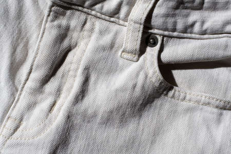 Zipper pocket and buttons close-up detail of light black jeans denim
