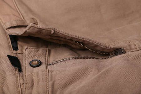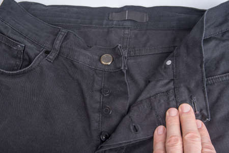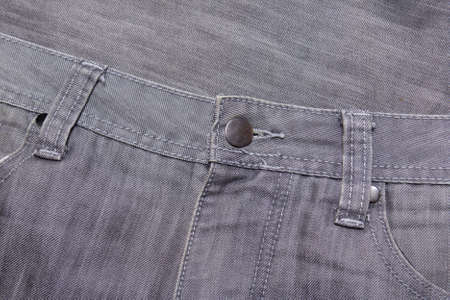 Gray trendy fashionable jeans lie unbuttoned. Zipper on the pants. Casual comfortable clothes.