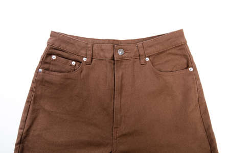Folded brown trousers. V-shape of unisex pants, bright beige wooden desks surface background.