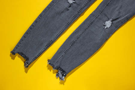 Minimalism fashion concept. Ripped trendy jeans on a yellow background. Top view