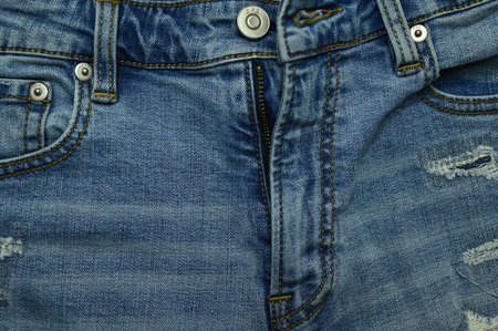 Details of denim trousers. Pockets and seams on denim. Old blue denim. The texture of the fibers of the denim. Background.