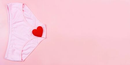 Top view Pink underpants and red heart pink isolated banner background with copy space. Woman hygiene, Concept of critical days, menstruation,health care