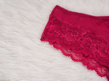 Lace of raspberry panties on white fur. Close up. Fashionable concept of lingerie