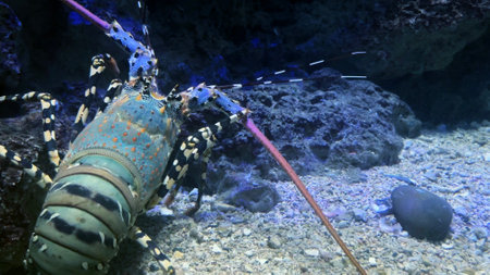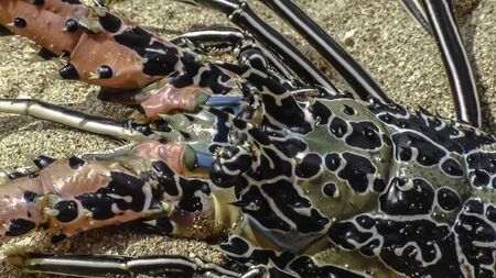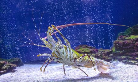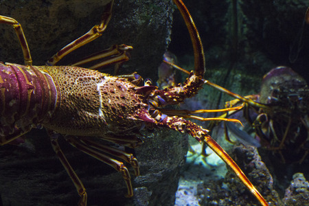 Lobster in the aquarium. Macro photo of spiny lobster.