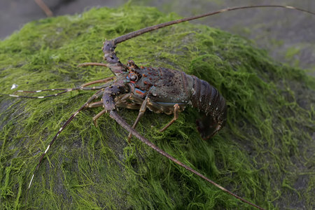 Close-up of blue spiny lobster on the rock in the wild